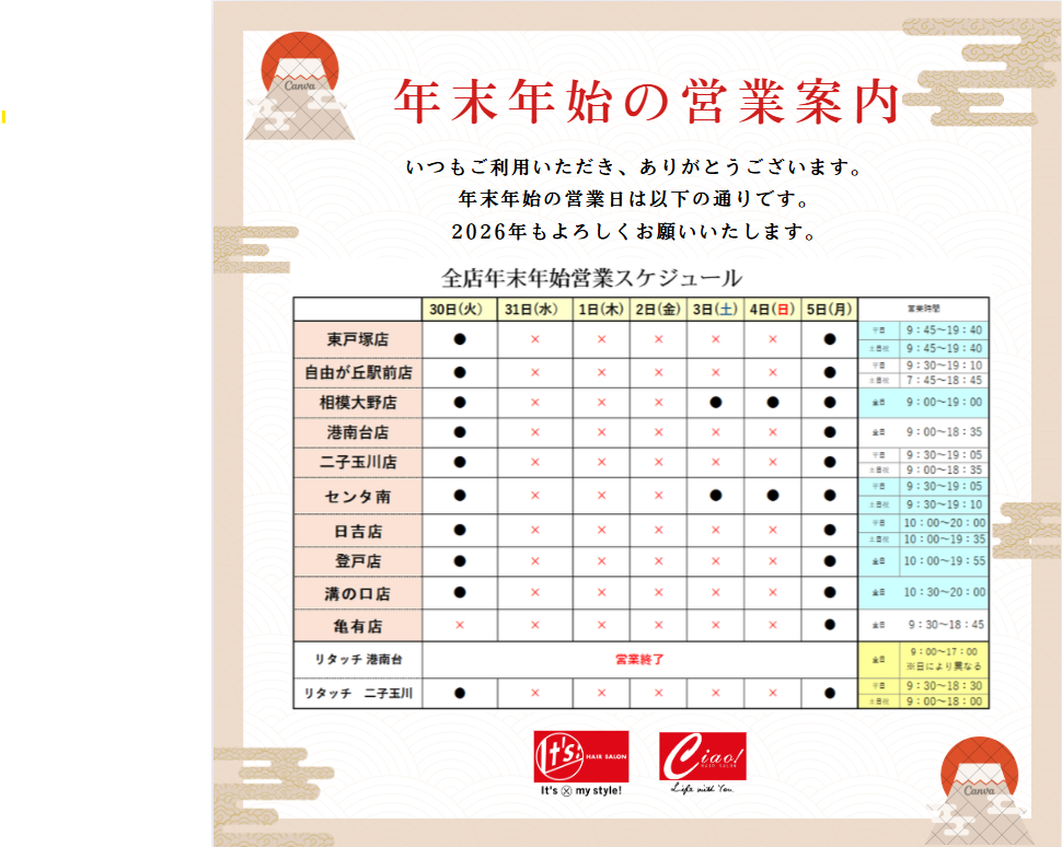 いつもヘアカットサロンイッツ!チャオ!をご愛顧賜り誠にありがとうございます。